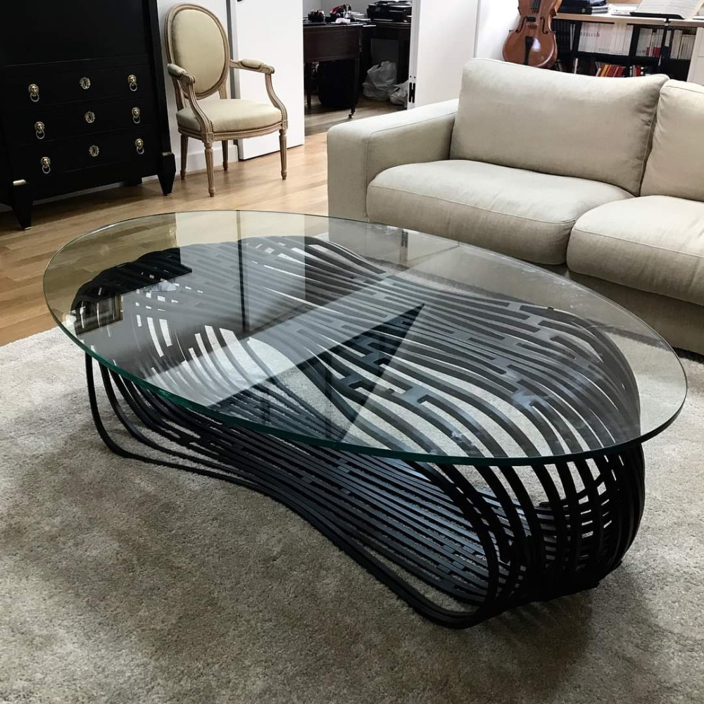 Кованый стол «Ритм Линий» – это воплощение современного дизайна и динамики, вдохновленное ритмичными движениями. Его металлическая основа с переплетающимися линиями и стеклянная столешница создают эффектный акцент для стильных гостиных в стиле лофт или минимализм.
